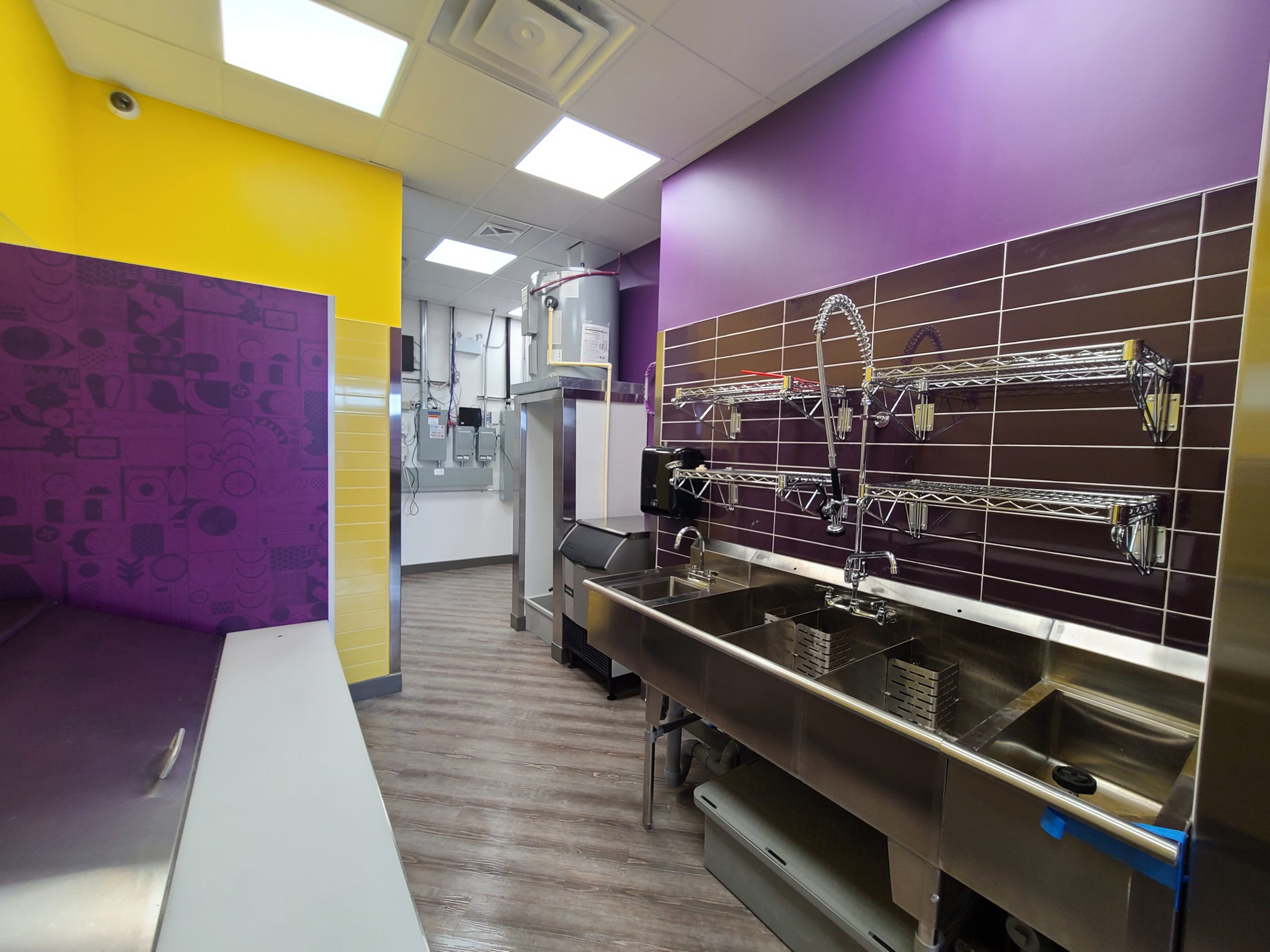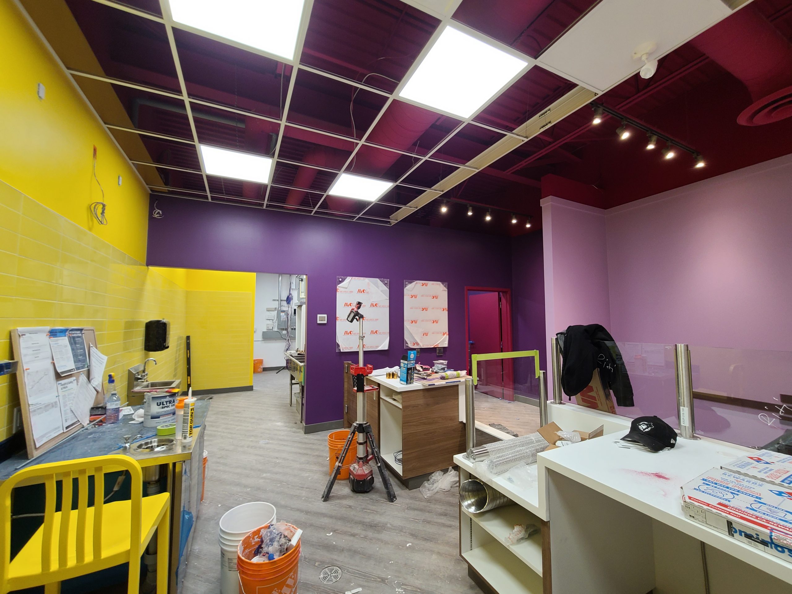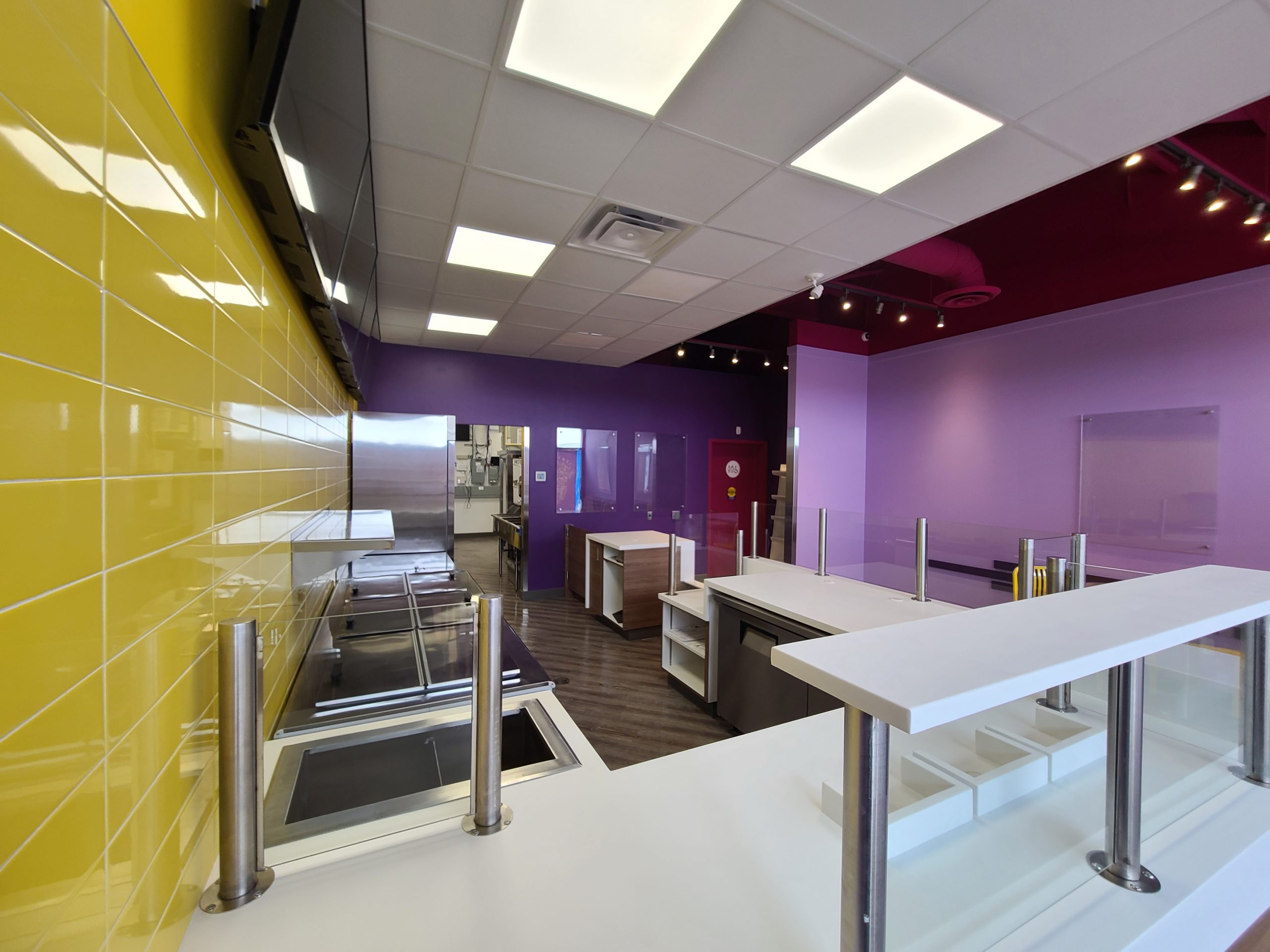 Scope: 1200 sq. ft. QSR build. End-to-end construction with underground plumbing, framing, new electrical/HVAC/plumbing, millwork and corian counters, flooring, painting, tiles, and all city inspections with air balance.