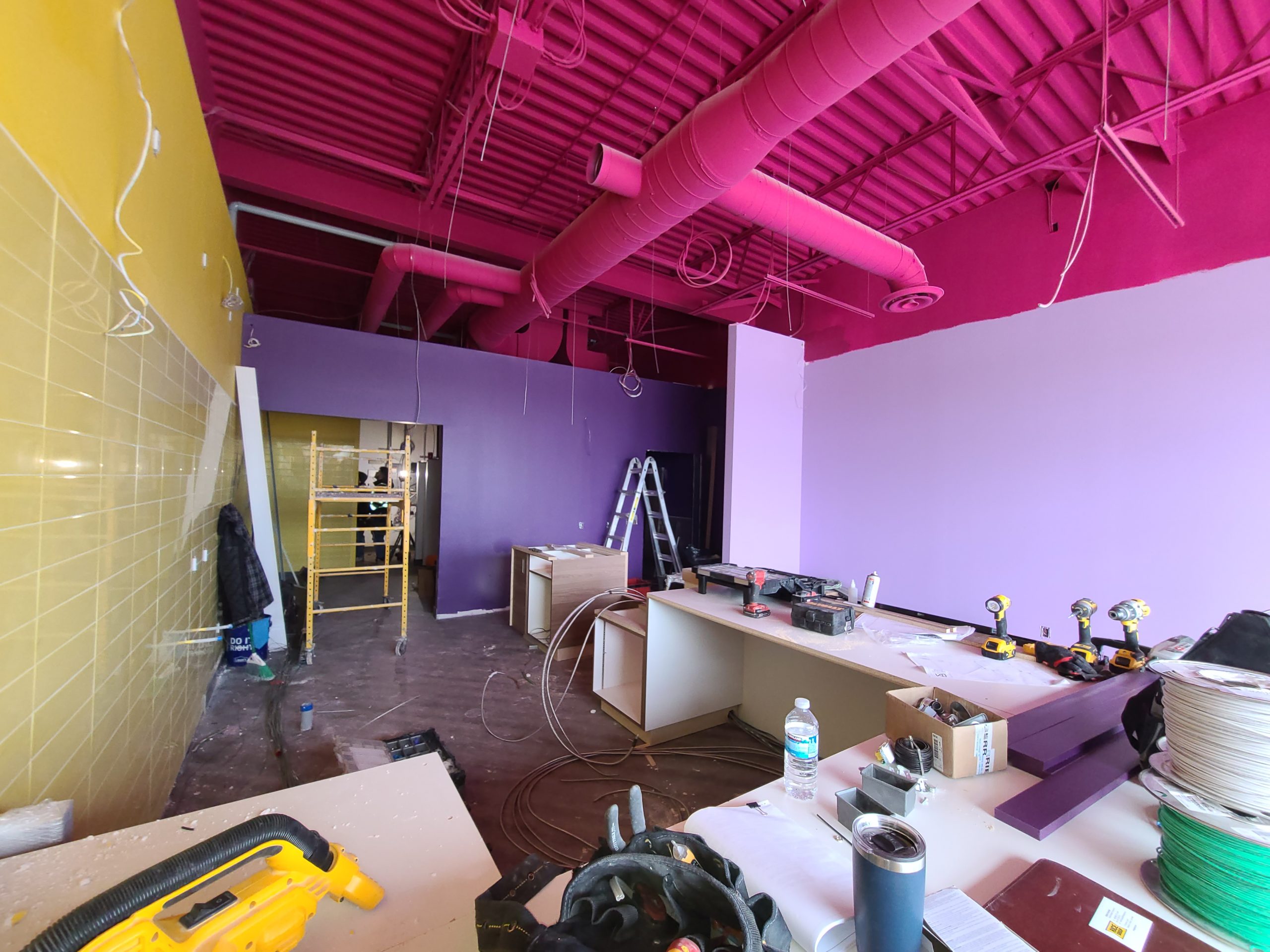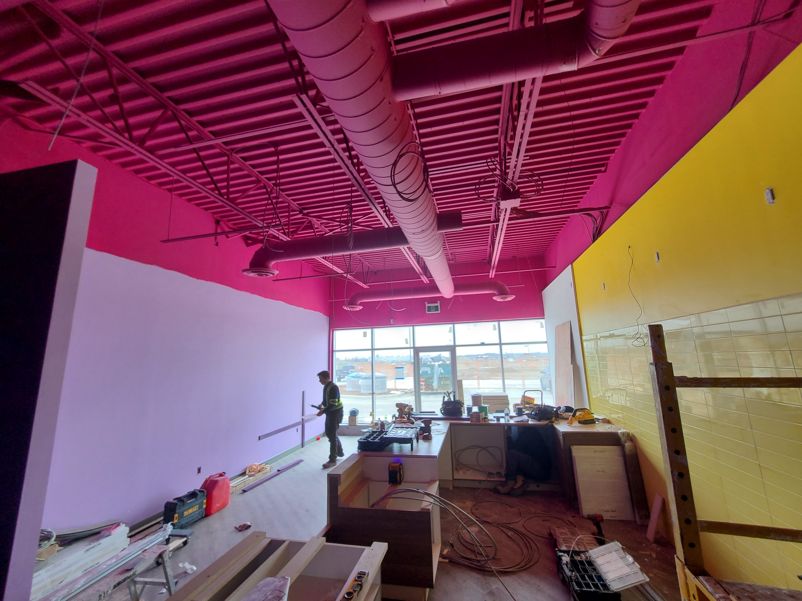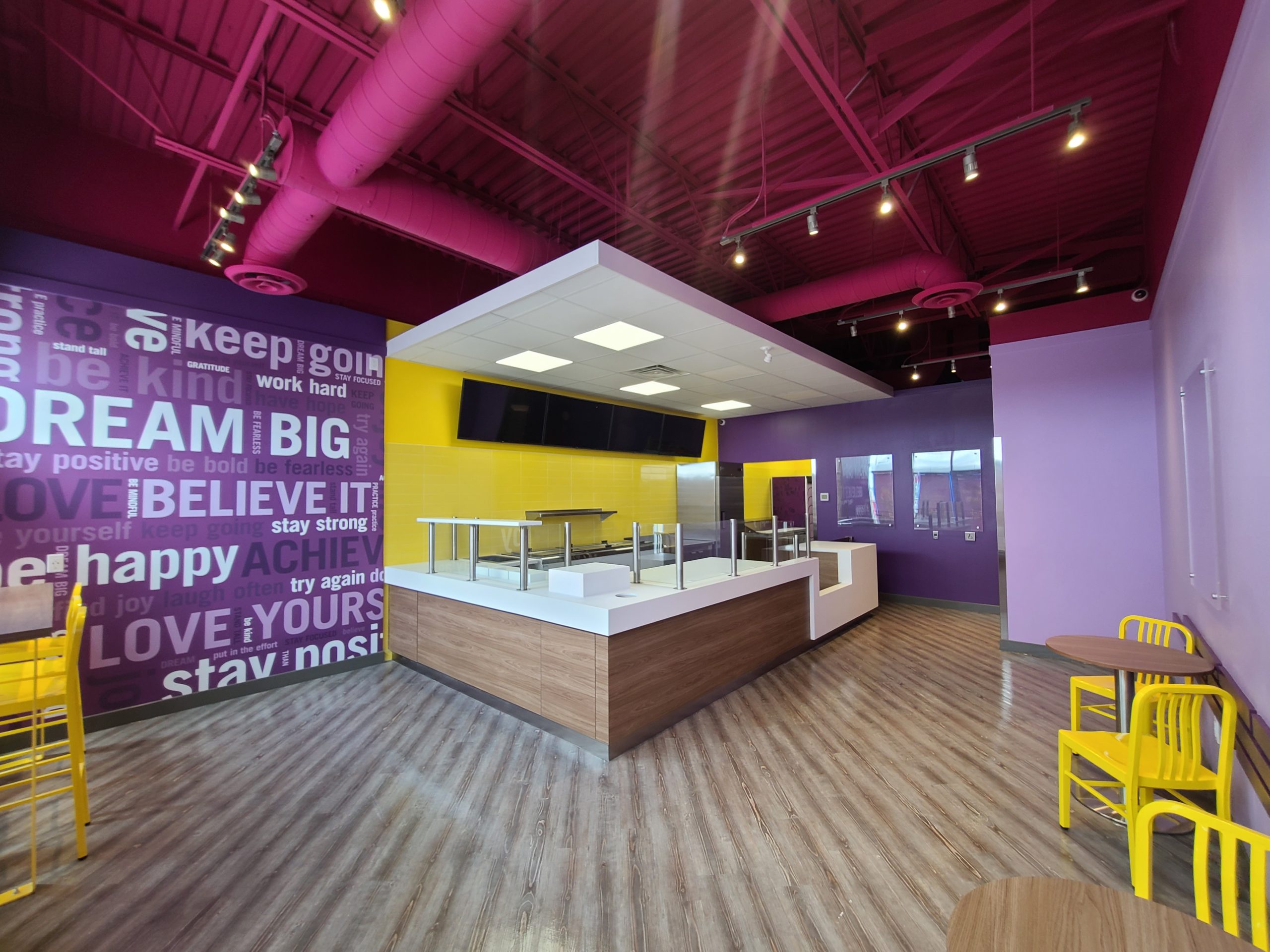 Scope: 1200 sq. ft. QSR build. End-to-end construction with underground plumbing, framing, new electrical/HVAC/plumbing, millwork and corian counters, flooring, painting, tiles, and all city inspections with air balance.