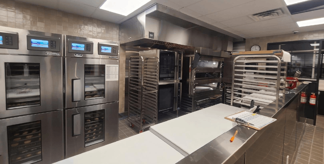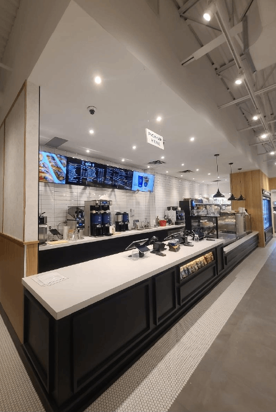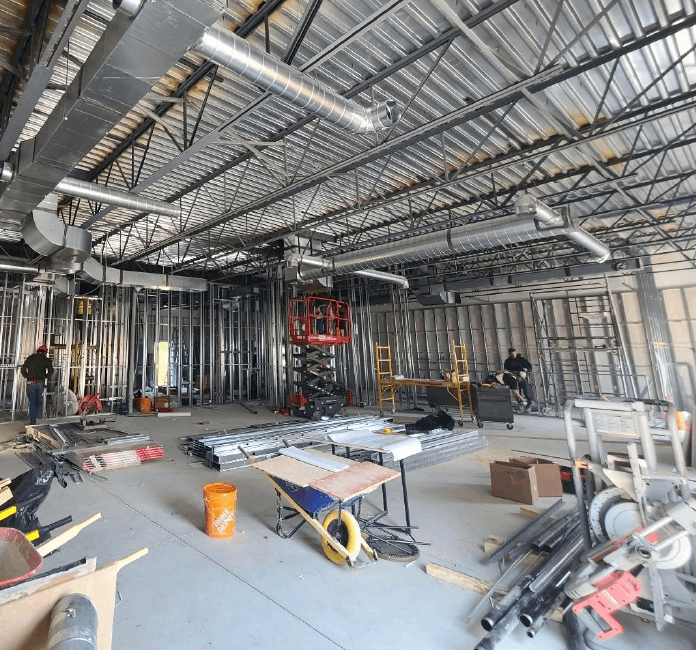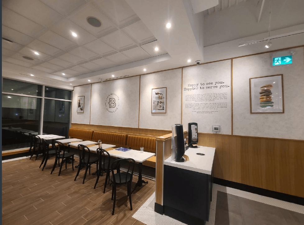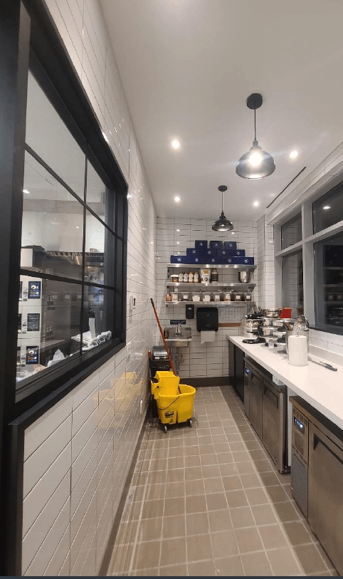 Scope: 3600 sq. ft. bakery and cafe build. End-to-end construction, with underground plumbing, framing, new 600A electrical, HVAC with welded ductwork, commercial hood with fire suppression system, plumbing, millwork and wainscoting installation, flooring, painting, tiles, and all city inspections with air balance.